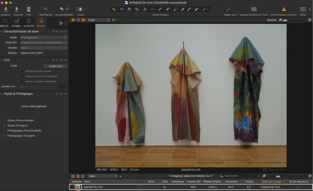 In my working environment, I have become accustomed to using a range of professional photography software, including Adobe Bridge, the Adobe Suite, Lightroom, Camera Raw, Nikon programs, and others. I work extensively with Capture One, which connects the camera directly to the computer, allowing to adjust photographic settings and begin live post-production. This workflow ensures that the digital version of each artwork faithfully reproduces the original’s physical and colorimetric properties. On the left, there is a photo in Capture One of an installation by Sam Gilliam that I photographed in Basel in 2018—an artist who works extensively with colors and their subtle variations, and the challenge is precisely to capture them perfectly in the photographs.